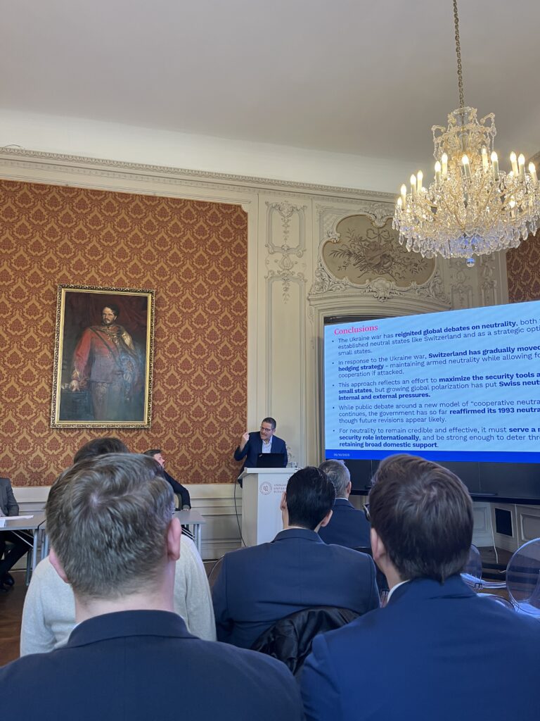 Jean-Marc Rickli of the Geneva Centre for Security Policy (GCSP) opened the first panel with a presentation on Swiss neutrality. He highlighted that in the past, neutrality primarily served to protect national independence and entailed a clear distance from military alliances, a view that was particularly pronounced during the Cold War. After 1990, the concept shifted toward an active, mediating neutrality, in which Switzerland acted as a bridge-builder and partner in international peace processes. The war in Ukraine put this position to the test: on the one hand, the importance of territorial defense was reemphasized, while on the other, Switzerland consistently maintained its ban on arms exports. Today, Swiss neutrality finds itself caught in the tension between historical continuity, new global conflicts, and domestic political initiatives to reinterpret the concept of neutrality.