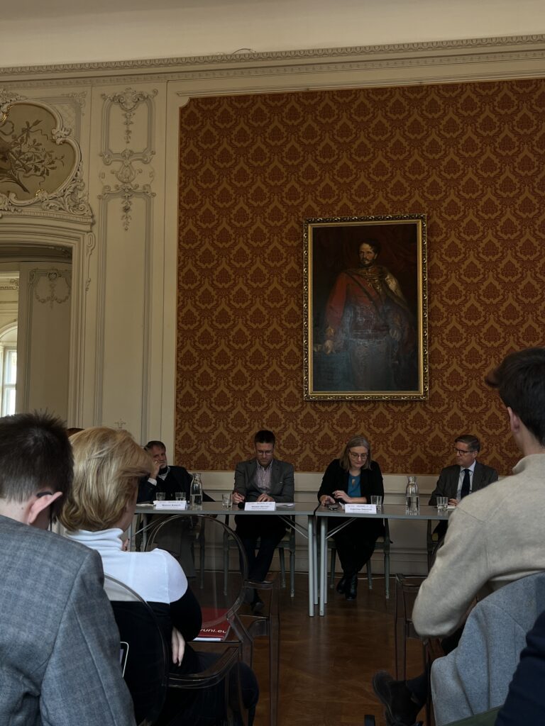 The next lecture was given by Christoph Schwarz from the Austria Institute for European and Security Policy (AIES) on Austria’s neutrality since 1955, in which he demonstrated how neutrality has changed over time. This ranged from the phase of consolidation to the current phase of stagnation and Europeanization. The focus of the presentation was the tension between Austrian neutrality and EU membership, particularly with regard to mutual assistance obligations. Russia’s war against Ukraine represented a turning point in which neutrality became increasingly politicized again, although its practical interpretation changed little. Finally, survey results were presented, providing insights into current opinions and controversies surrounding the role of Austrian neutrality.