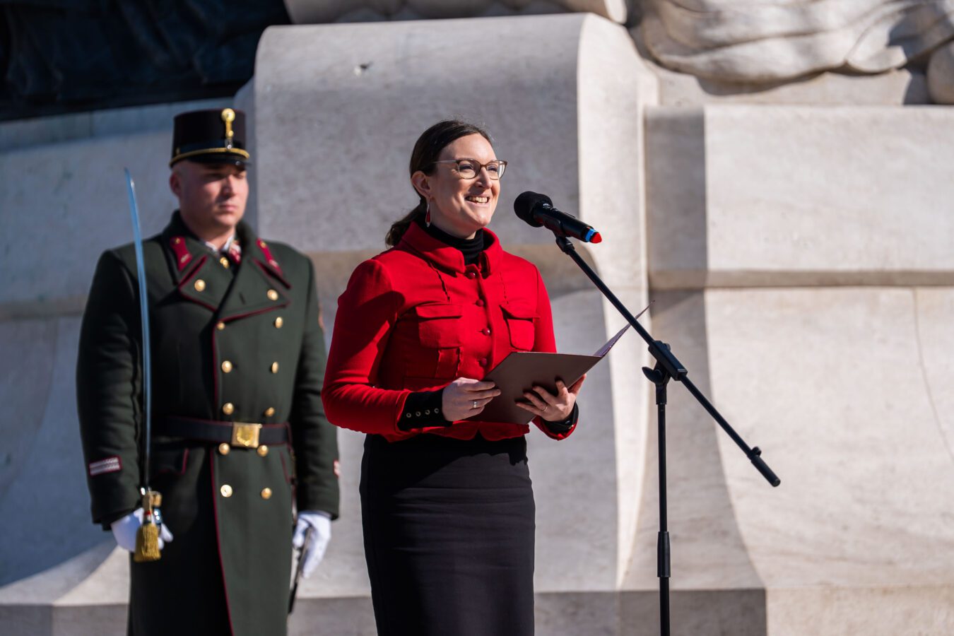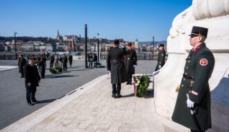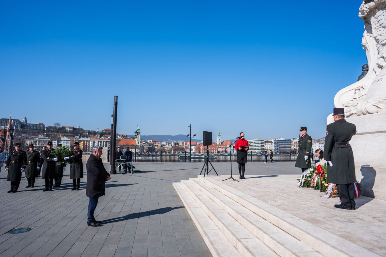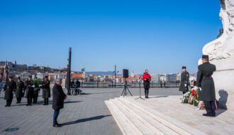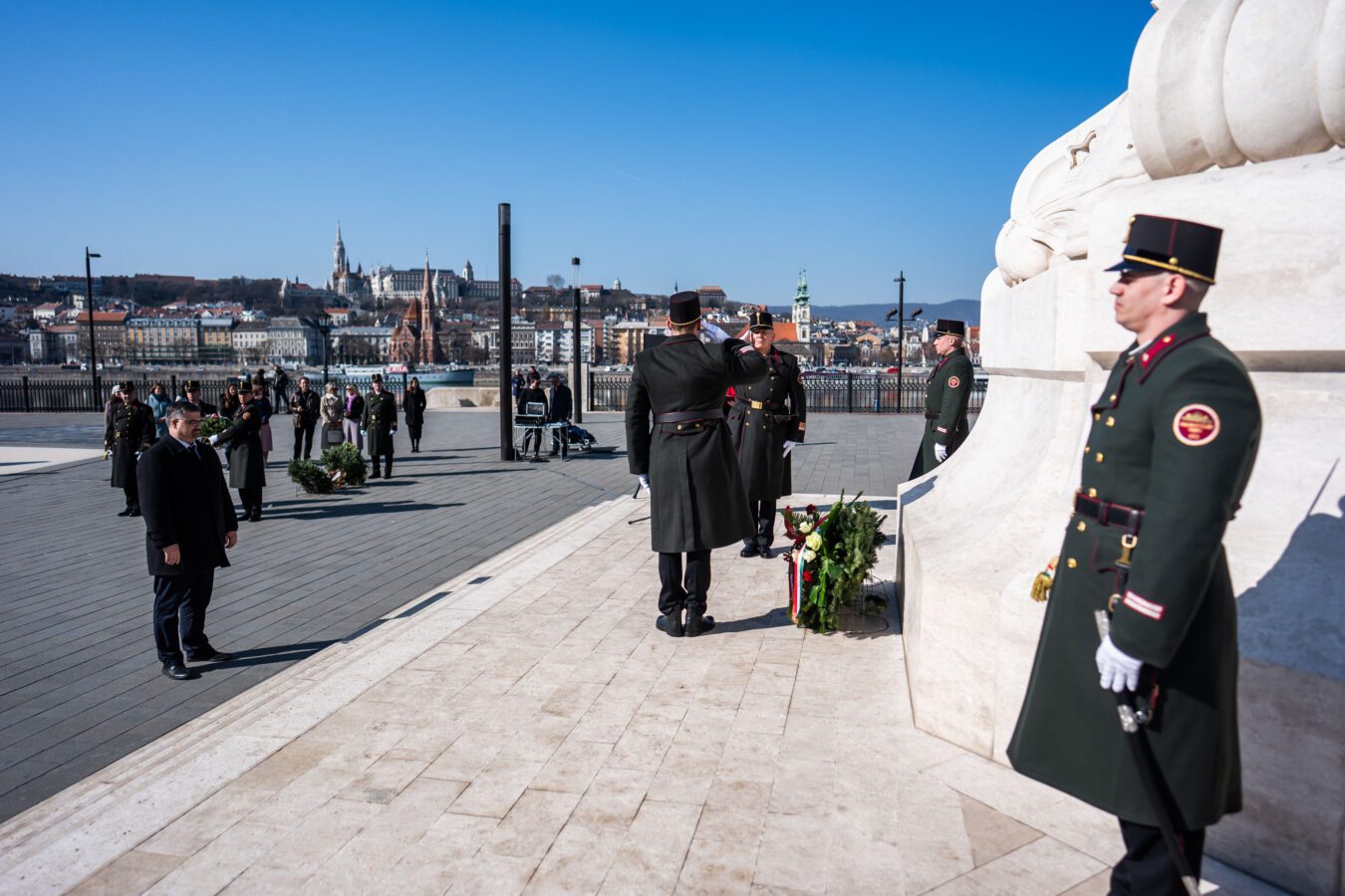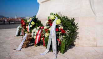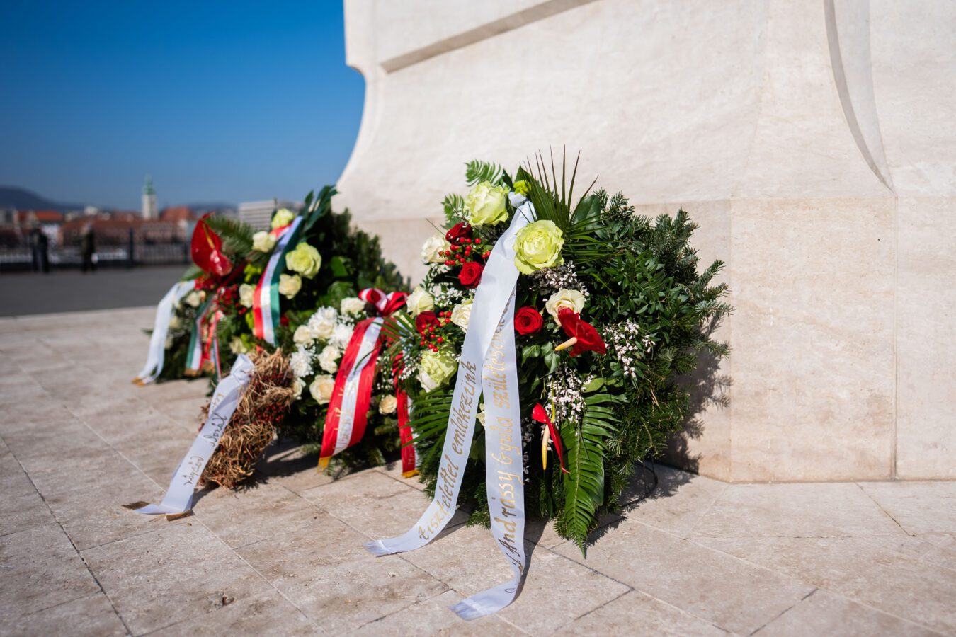 Im Anschluss an die Ansprache folgte die feierliche Kranzniederlegung. Kränze wurden niedergelegt von Direktor Gábor Szigeti im Namen des ungarischen Parlaments, von Dr. György Ujsághy, Staatssekretär für Verwaltung, im Namen des Ministeriums für Kultur und Innovation, von Botschafterin Edit Szilágyiné Bátorfi im Namen der ungarischen Botschaft in Wien, von Dr. László Barabás, Honorarkonsul der Republik Österreich, von Prof. Dr. Géza Horváth im Namen der Károli Gáspár Universität der Reformierten Kirche in Ungarn sowie von Rektor Prof. Dr. Zoltán Tibor Pállinger im Namen der AUB.