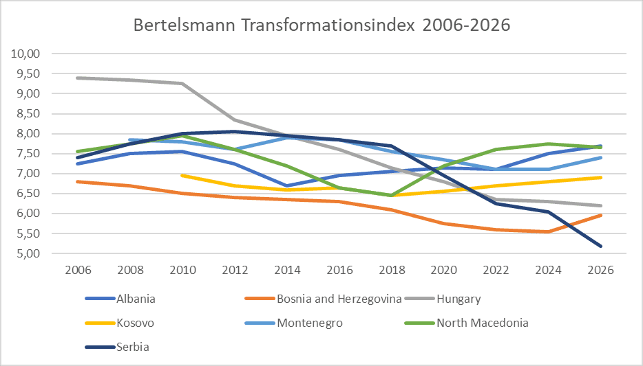 Die Daten des Bertelsmann Transformationsindex (BTI) von 2006 bis 2026 machen erkenntlich, dass sich in den letzten Jahren unterschiedliche Krisen, von der Finanzkrise (ab 2008), der Migrationskrise (ab 2015), der COVID-Pandemie (ab 2020) bis zur illegalen Invasion Russlands in der Ukraine (ab 2022), negativ auf die Qualität der Demokratie auswirkten. Die Staaten des Westbalkans (Albanien, Bosnien-Herzegowina, Kosovo, Montenegro, Nordmazedonien und Serbien) haben laut der unterschiedlichen Indizes seit dem Systemwechsel Anfang der 1990er Jahre nie den Status einer konsolidierten Demokratie erreicht und die erzielten Erfolge der Demokratisierung gingen in den Jahren nach 2010 wieder verloren (vgl. Abb. 1). In seinem letzten Bericht von März 2026 stufte der BTI Albanien, Kosovo Montenegro und Nordmazedonien als defekte Demokratien ein, Bosnien-Herzegowina als stark defekte Demokratie und Serbien als gemäßigtes autokratisches Regime. Damit befindet sich Ungarn in guter Gesellschaft, da es selbst als defekte Demokratie kategorisiert wird (Bertelsmann Transformationsindex 2026b).